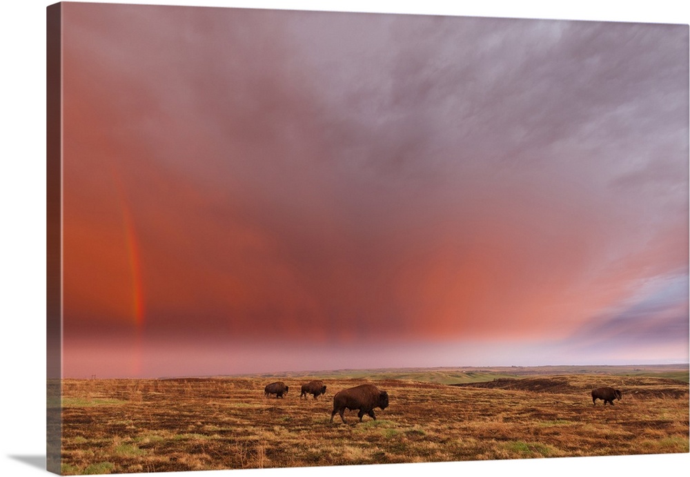 <p>American Bison (Bison Bison) And Rainbow After The Storm At Cross Ranch Preserve; North Dakota, United States Of America</p>