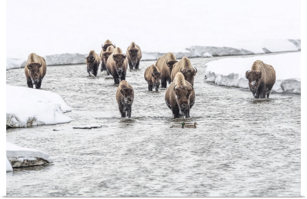 <p>American bison (Bison bison) walking in the water at Alum Creek in winter with a pair of mallard ducks (Anas platyrhynchos) crossing the stream, Yellowstone National Park Wyoming, United States of America</p>