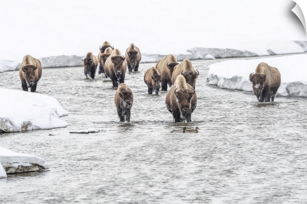 <p>American bison (Bison bison) walking in the water at Alum Creek in winter with a pair of mallard ducks (Anas platyrhynchos) crossing the stream, Yellowstone National Park Wyoming, United States of America</p>