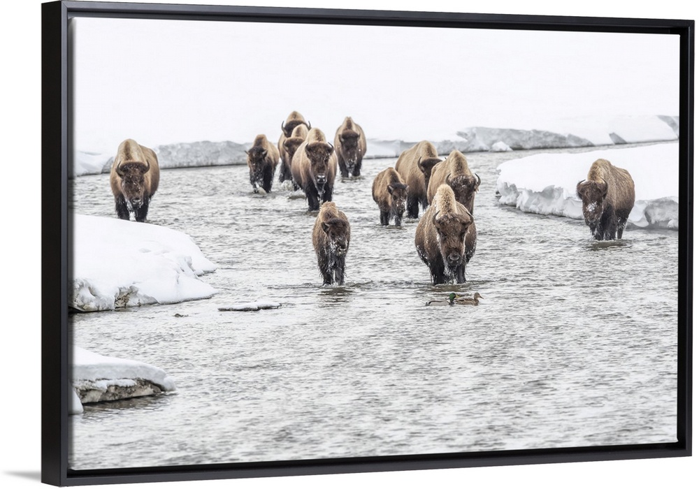 <p>American bison (Bison bison) walking in the water at Alum Creek in winter with a pair of mallard ducks (Anas platyrhynchos) crossing the stream, Yellowstone National Park Wyoming, United States of America</p>