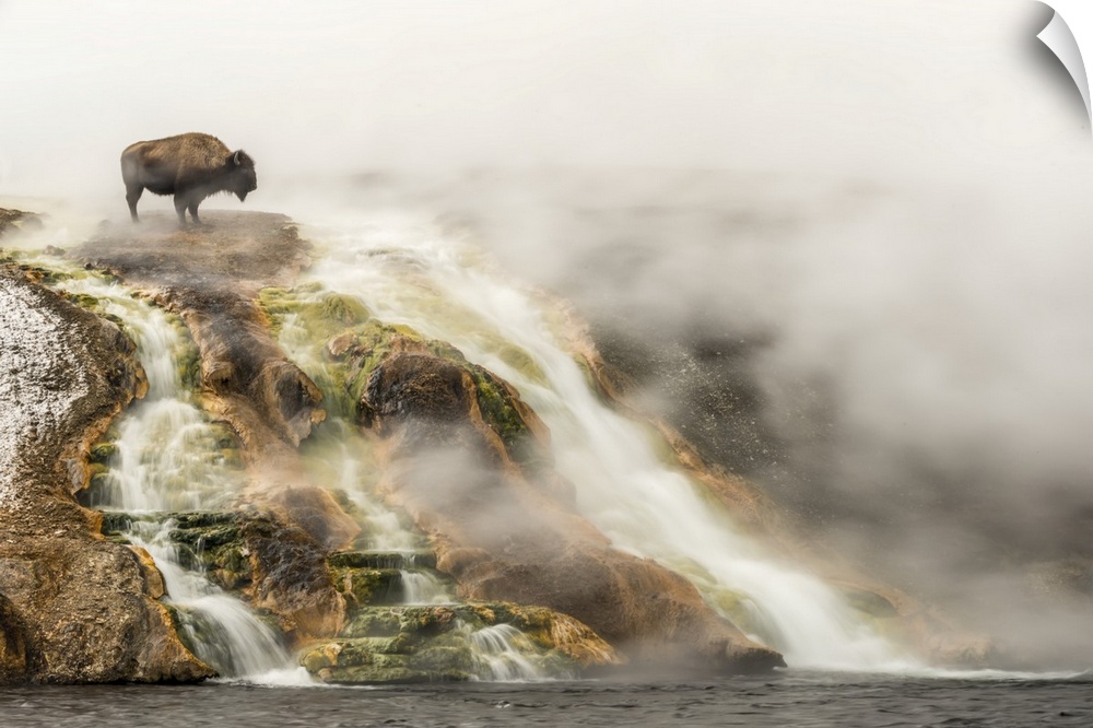 <p>American bison (Bison bison) on top of a cliff surrounded by steam from the Excelsior Geyser at the Midway Geyser Basin looking over the edge at the Firehole River in Yellowstone National Park, Wyoming, United States of America</p>