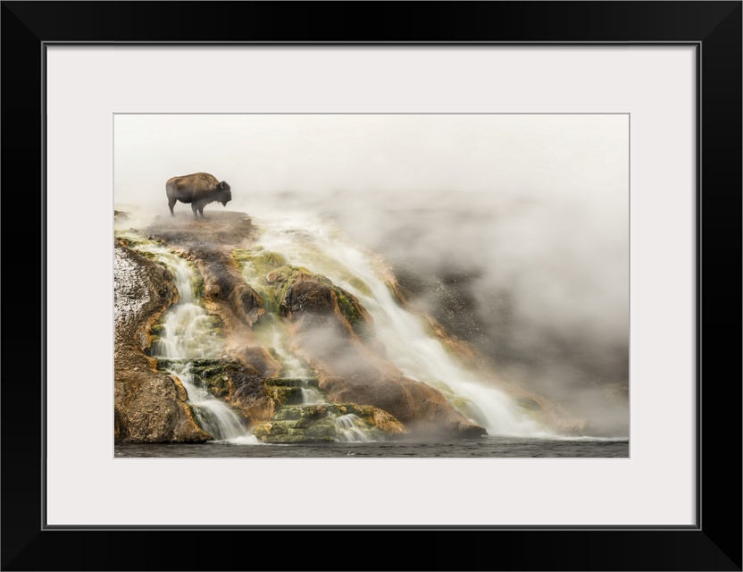 <p>American bison (Bison bison) on top of a cliff surrounded by steam from the Excelsior Geyser at the Midway Geyser Basin looking over the edge at the Firehole River in Yellowstone National Park, Wyoming, United States of America</p>