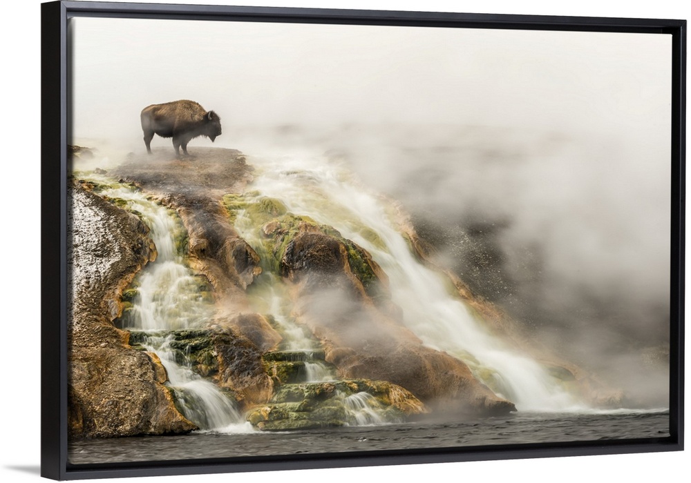 <p>American bison (Bison bison) on top of a cliff surrounded by steam from the Excelsior Geyser at the Midway Geyser Basin looking over the edge at the Firehole River in Yellowstone National Park, Wyoming, United States of America</p>