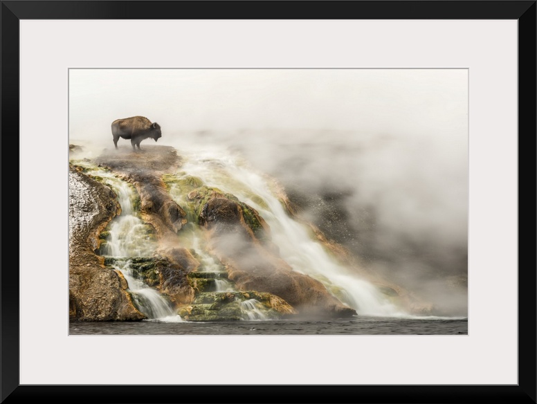 <p>American bison (Bison bison) on top of a cliff surrounded by steam from the Excelsior Geyser at the Midway Geyser Basin looking over the edge at the Firehole River in Yellowstone National Park, Wyoming, United States of America</p>