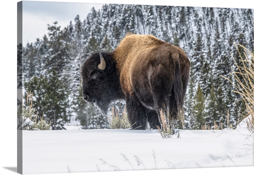 <p>American Bison bull (Bison bison) standing in snow in Yellowstone National Park; Wyoming, United States of America.</p>