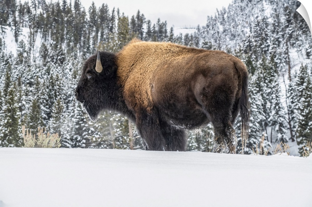 <p>American Bison bull (Bison bison) standing in snow in Yellowstone National Park; Wyoming, United States of America.</p>
