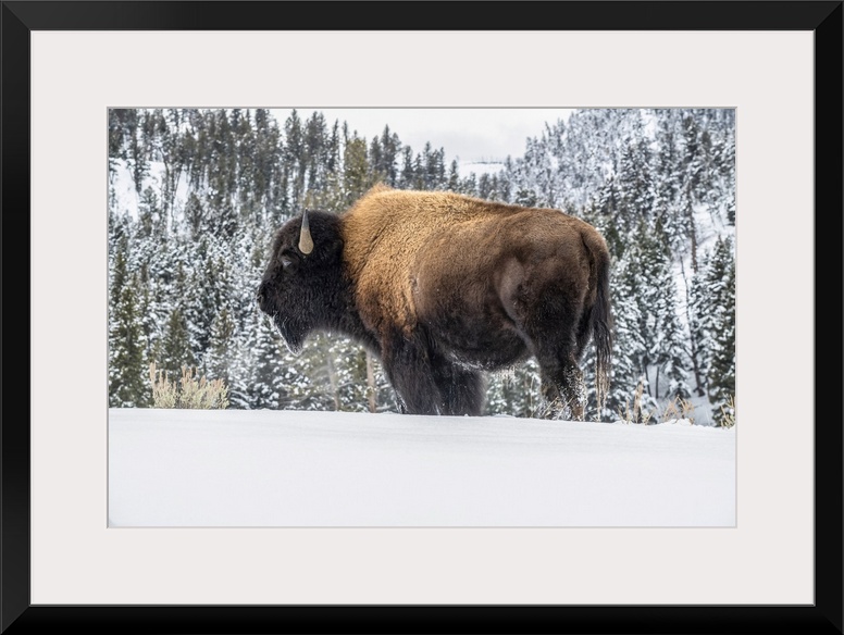 <p>American Bison bull (Bison bison) standing in snow in Yellowstone National Park; Wyoming, United States of America.</p>