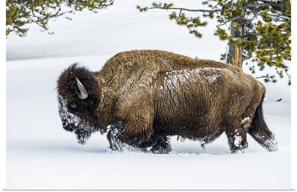 <p>American Bison bull (Bison bison) plowing through deep snow in the Firehole River Valley, Yellowstone National Park; Wyoming, United States of America</p>