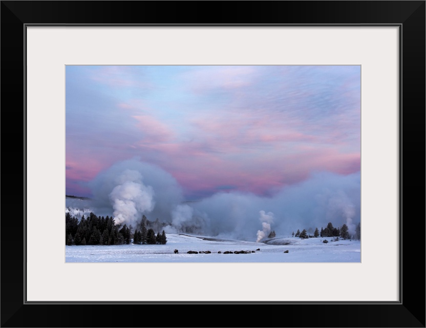 <p>American Bison Next To Castle Geyser Erupting At Sunrise, Yellowstone National Park, Wyoming</p>