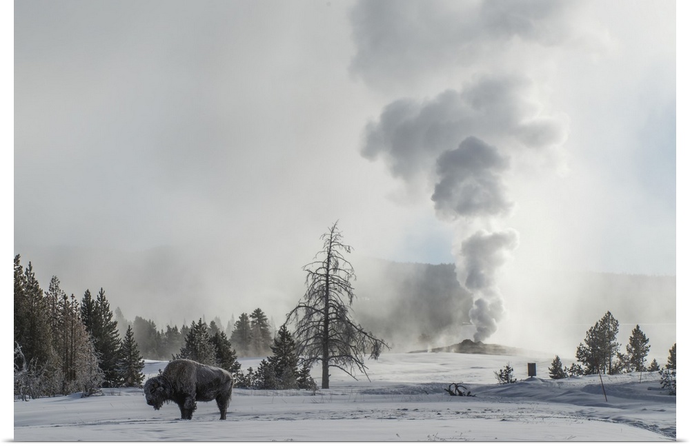 <p>American Bison (Bison bison) stands on snow with Old Faithful erupting in the background, Upper Geyser Basin in Yellowstone National Park Wyoming, United States of America</p>
