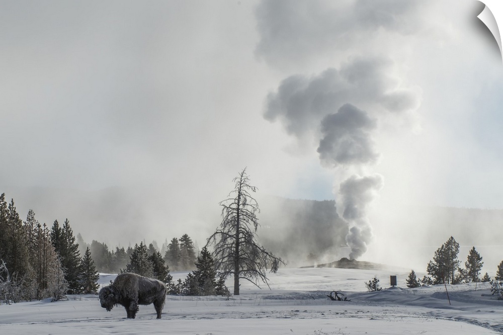 <p>American Bison (Bison bison) stands on snow with Old Faithful erupting in the background, Upper Geyser Basin in Yellowstone National Park Wyoming, United States of America</p>