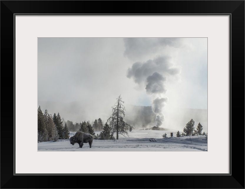 <p>American Bison (Bison bison) stands on snow with Old Faithful erupting in the background, Upper Geyser Basin in Yellowstone National Park Wyoming, United States of America</p>