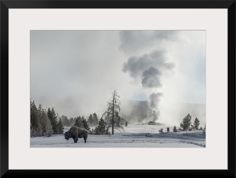 <p>American Bison (Bison bison) stands on snow with Old Faithful erupting in the background, Upper Geyser Basin in Yellowstone National Park Wyoming, United States of America</p>