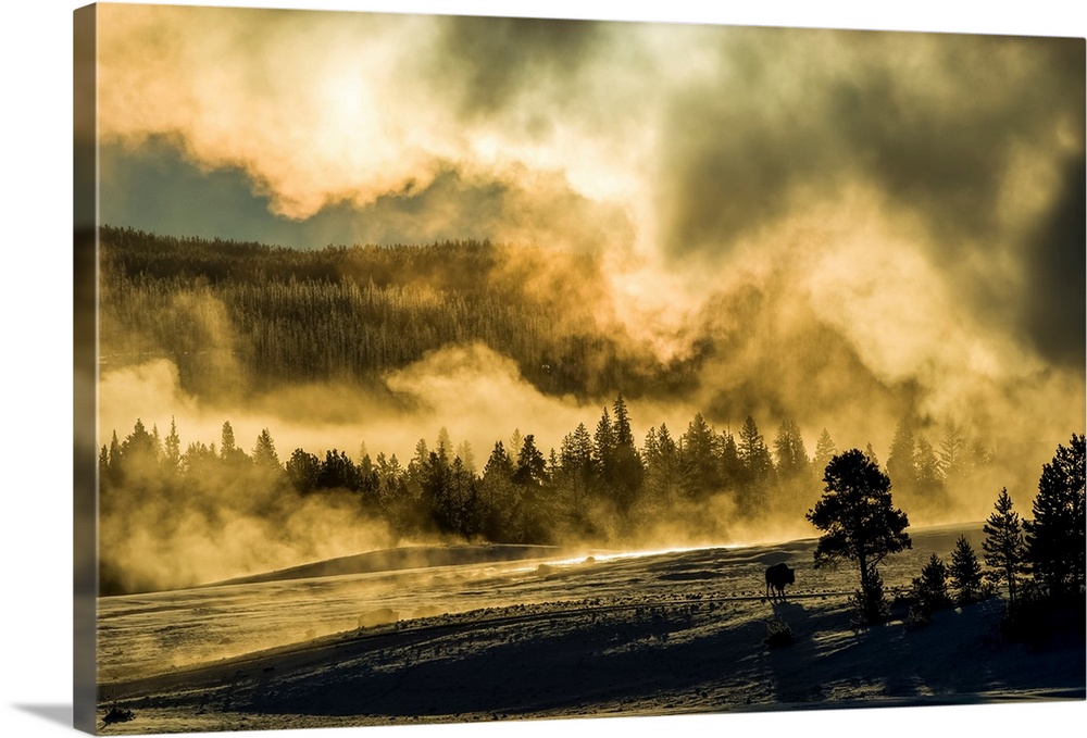 <p>American Bison (Bison bison) stands on the snow covered landscape keeping warm from the thermal steam of Old Faithful illuminated by the golden light of sunrise in the Upper Geyser Basin, Yellowstone National Park, United States of America</p>