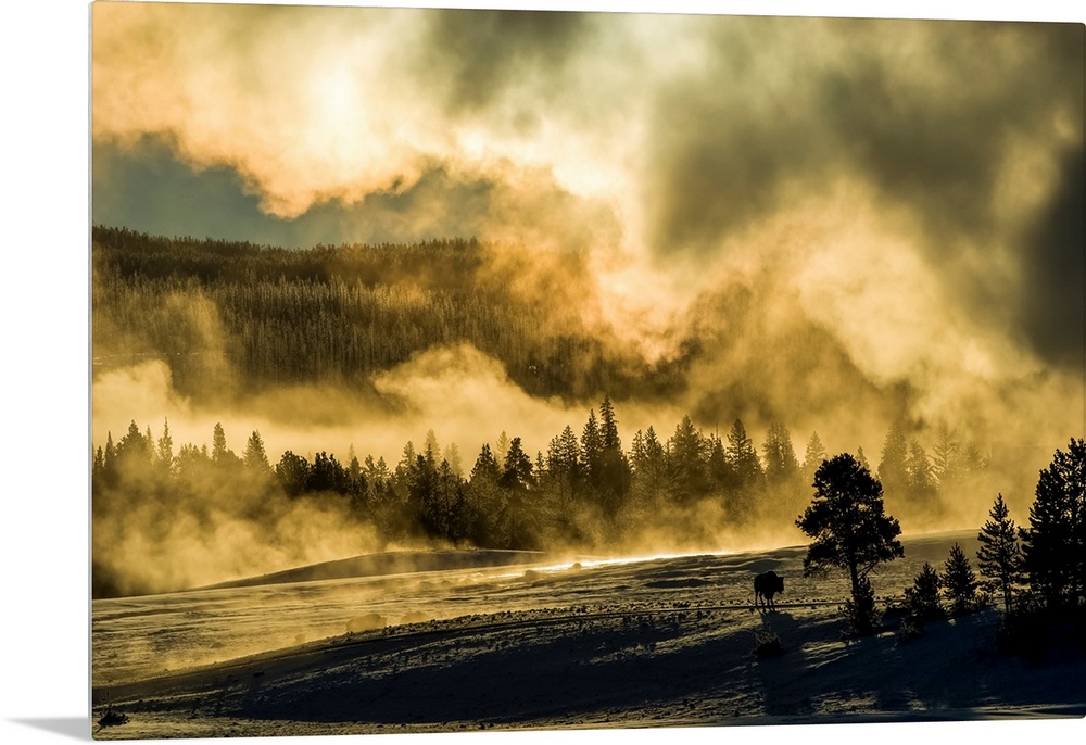 <p>American Bison (Bison bison) stands on the snow covered landscape keeping warm from the thermal steam of Old Faithful illuminated by the golden light of sunrise in the Upper Geyser Basin, Yellowstone National Park, United States of America</p>