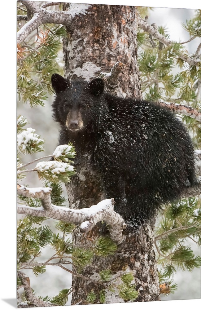 <p>An American black bear cub (Ursus americanus) sits on a snow covered Whitebark pine tree (Pinus albicaulis) branch looking around in Yellowstone National Park, Wyoming, United States of America</p>