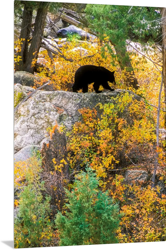 <p>American black bear (Ursus americanus) on top of a rocky ledge foraging along the banks of the Yellowstone River, climbing randomly around huge granite boulders up a cliff with fall colored foliage, eating leafy plants along the route, Yellowstone National Park, Wyoming, United States of America</p>
