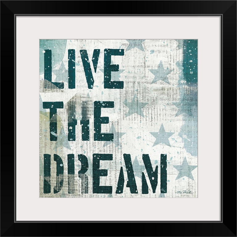 <p>Mixed media artwork of stars and stencil text "Live The Dream," with newspaper print in the background.</p>