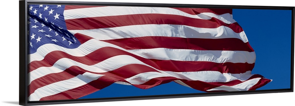 <p>Old Glory billowing in the wind on a bright day, with a clear blue sky in the background.</p>