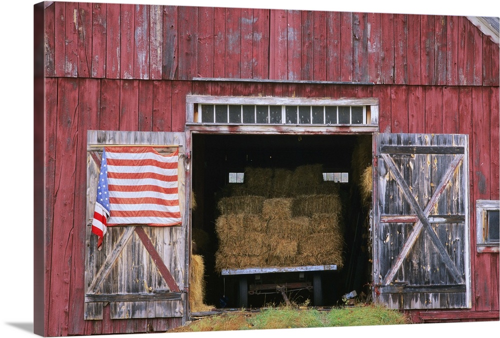 American flag hanging from a barn door