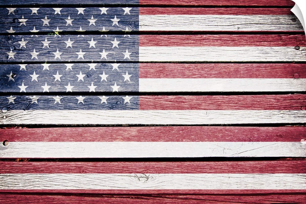 <p>American flag painted on old wood plank background.</p>