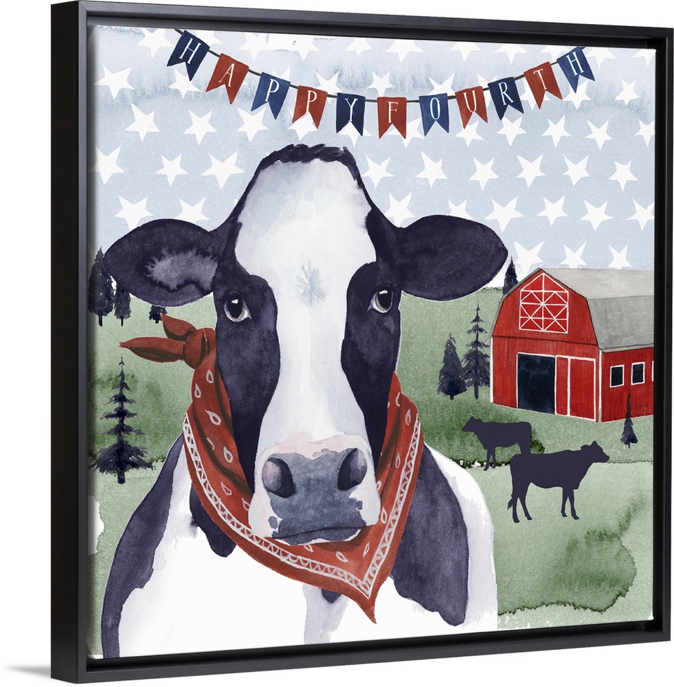 <p>Banner of "Happy Fourth" above a black and white cow with a red bandanna in front of a barn and field with white stars in a blue sky.</p>