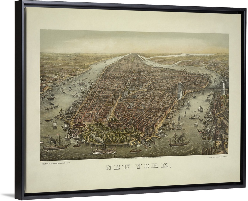 <p>American history print showing an illustrated bird's eye view of Manhattan, New York City.</p>