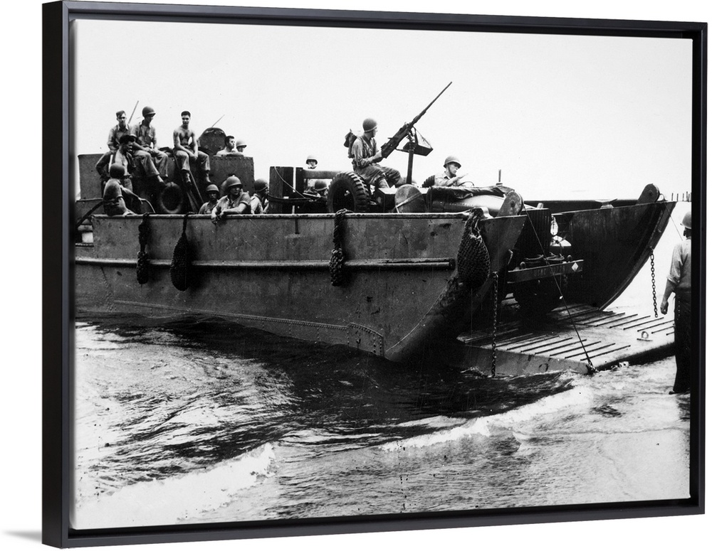 <p>An American landing craft dropping its ramp on the beach at Guadalcanal in the Solomon Islands, as the U.S. Marine reconnaissance car unloads. Photograph, c1942.</p>