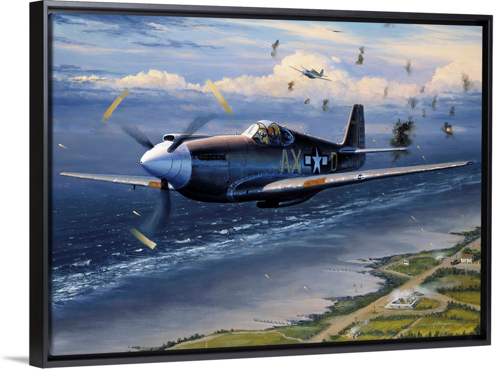 <p>American planes flying photographic reconnaissance over Normandy, France, in preparation for the Normandy Invasion, WWII, May 1944. They are flying the F-6A, the reconnaissance version of the P-51 Mustang. The 107th Observation Squadron, Michigan National Guard, one of 29 National Guard observation squadrons, became the first operational photographic reconnaissance squadron in Northern Europe in December 1943. Oil on canvas, by William S. Philllips, 1985.</p>