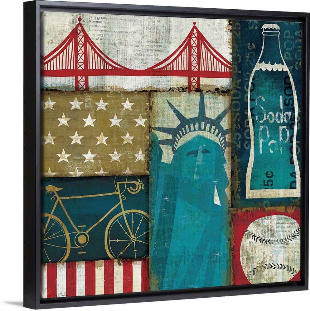<p>Painting of several United States landmarks and icons including the Statue of Liberty, a baseball, and the Golden Gate Bridge.</p>