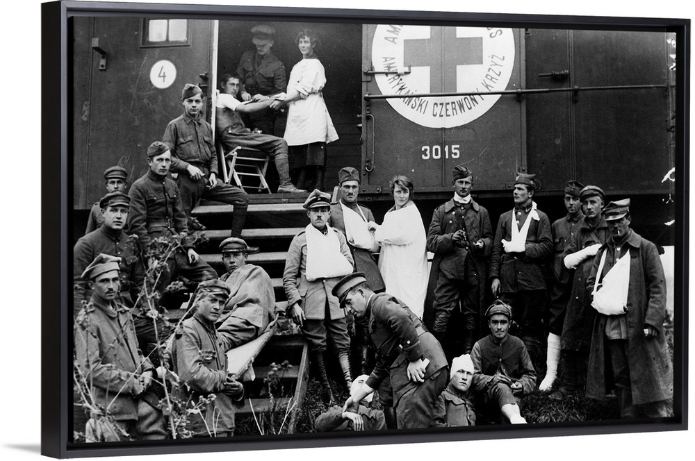 <p>American Red Cross workers operating out of a railroad car in Poland during World War I. Photograph, c1918.</p>