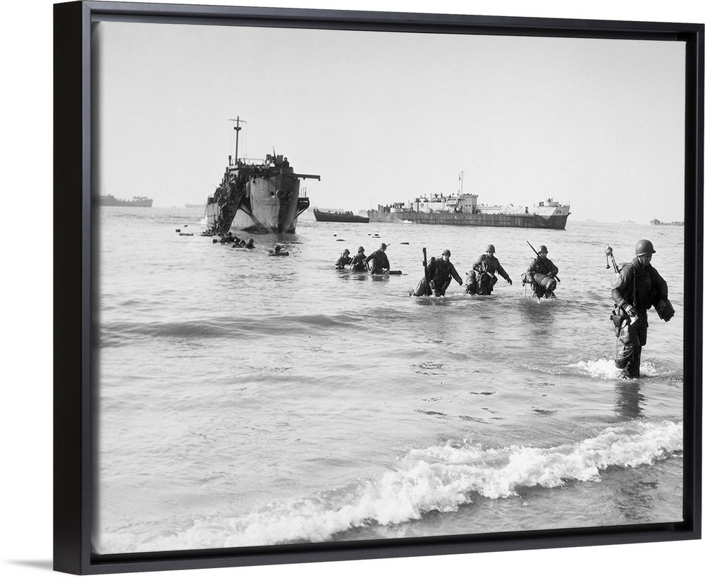 <p>American soldiers wading ashore on the American beachhead near Anzio, Italy. Photograph, 22 January 1944.</p>