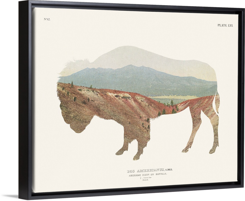 <p>Decorative artwork featuring a double exposure of a buffalo and a southwest landscape that is adorned with 'No.12, Plate LVL, Bos Americanus, Gmel, American Bison or Buffalo, 1/7 Natural size, Male'.</p>