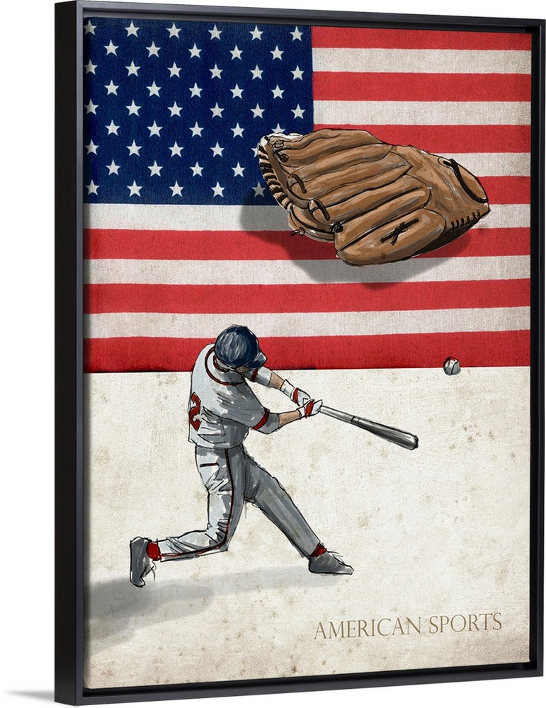 <p>A digital illustration of a baseball player swinging a bat at a ball with the american flag and "American Sports" in the background.</p>