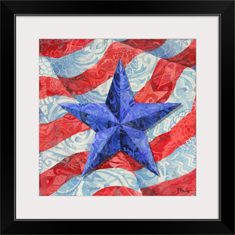 <p>Square decor with a blue painted star and a waving American flag in the background, all with decorative details painted on top.</p>