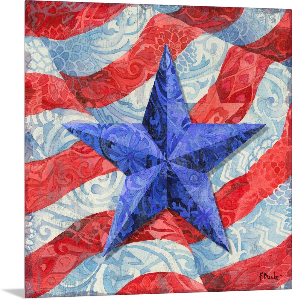 <p>Square decor with a blue painted star and a waving American flag in the background, all with decorative details painted on top.</p>