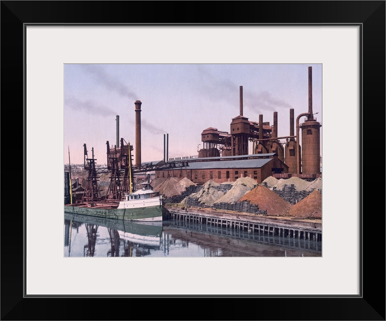 <p>Vintage color photo of an American Steel factory on the banks of a river with tall smoke stacks and piles of minerals.</p>