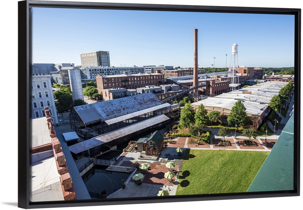 <p>Early morning sunlight shining on the redeveloped American Tobacco Historic District, with the Lucky Strike smokestack and water tower standing tall, Durham, North Carolina.</p>
