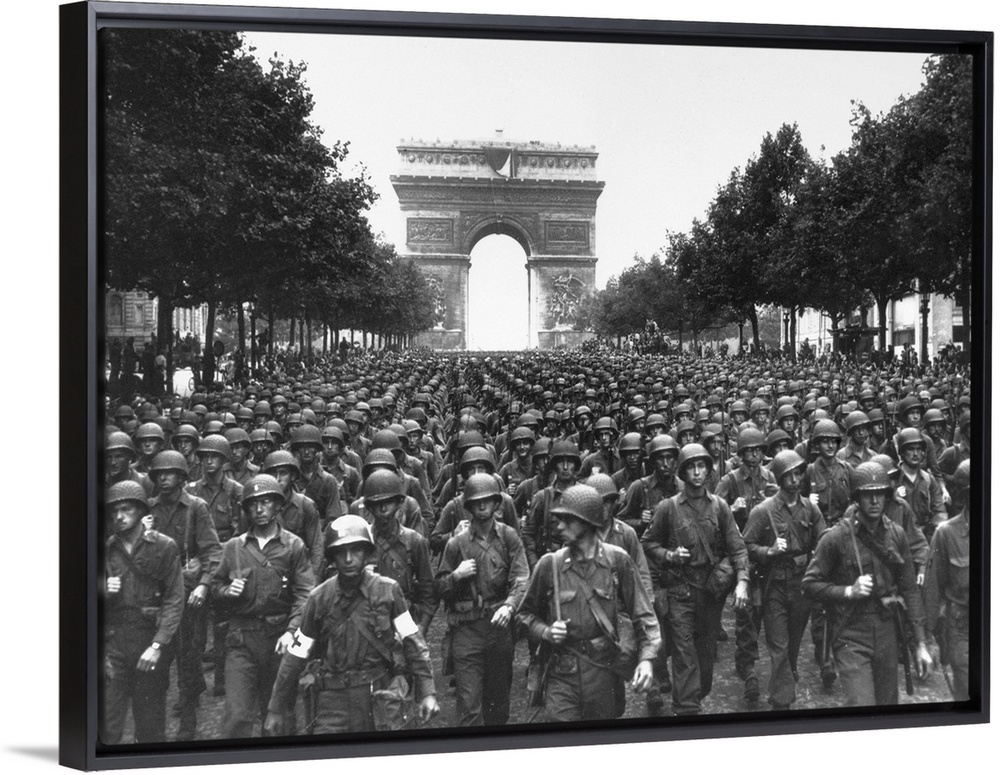 <p>American troops marching on the Avenue des Champs-?lys?es in Paris, France, with the Arc de Triomphe in the background. Photograph,1944</p>