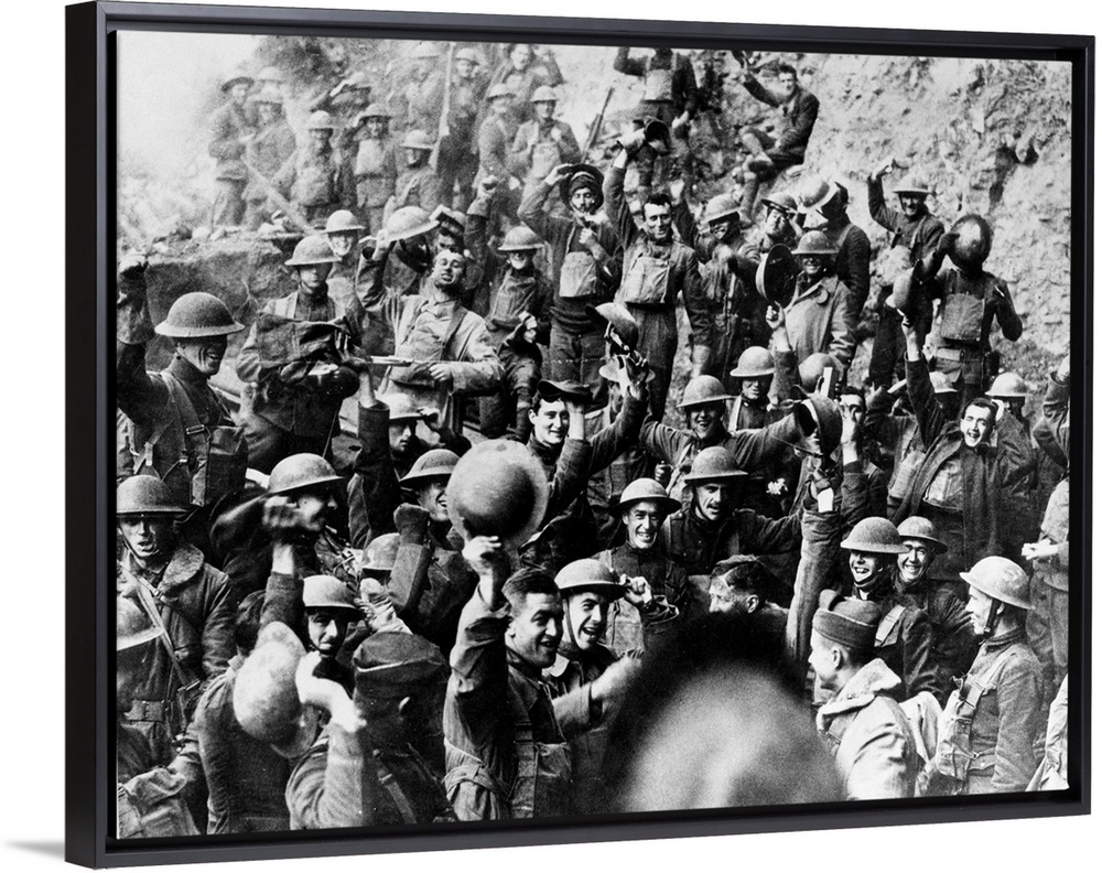 <p>American troops receive news of the armistice agreement ending World War I, November 1918.</p>