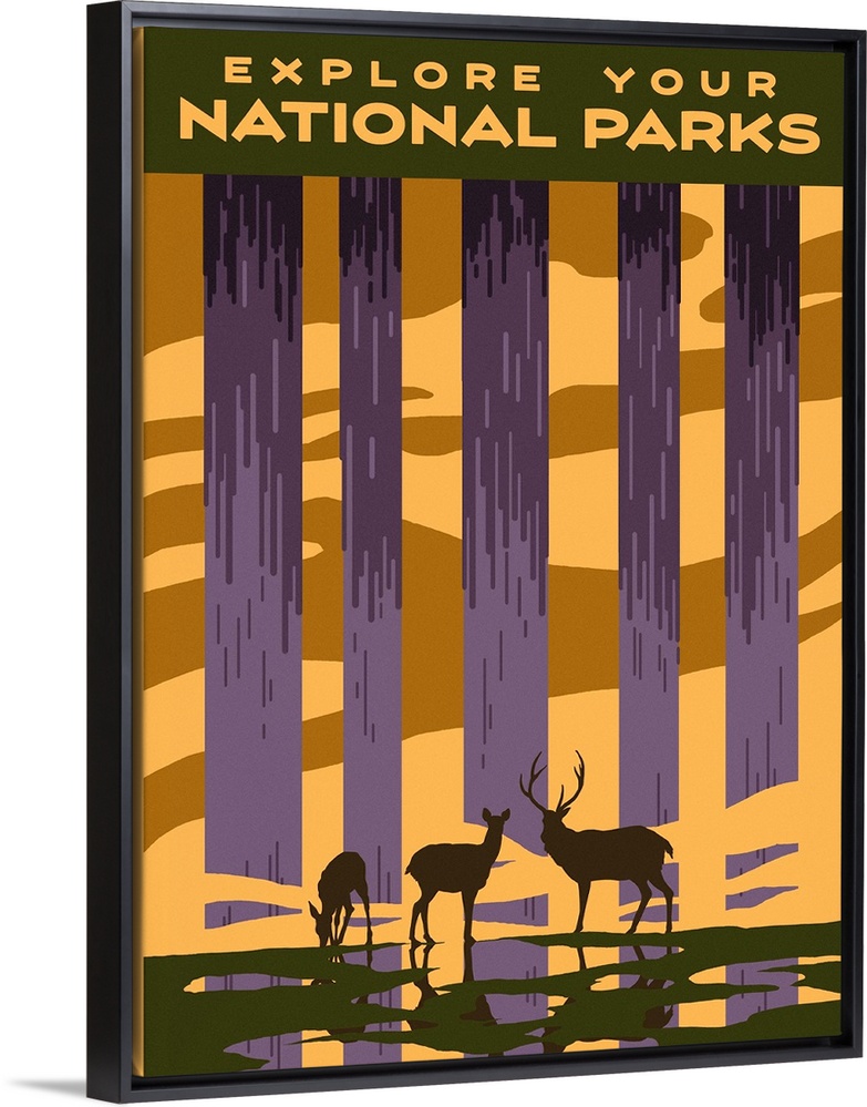 Art Decorative Art Graphic Art Jacob Green Landscapes Trees Travel Posters Retro Travel Posters Wildlife Deer Yellow Wall Art