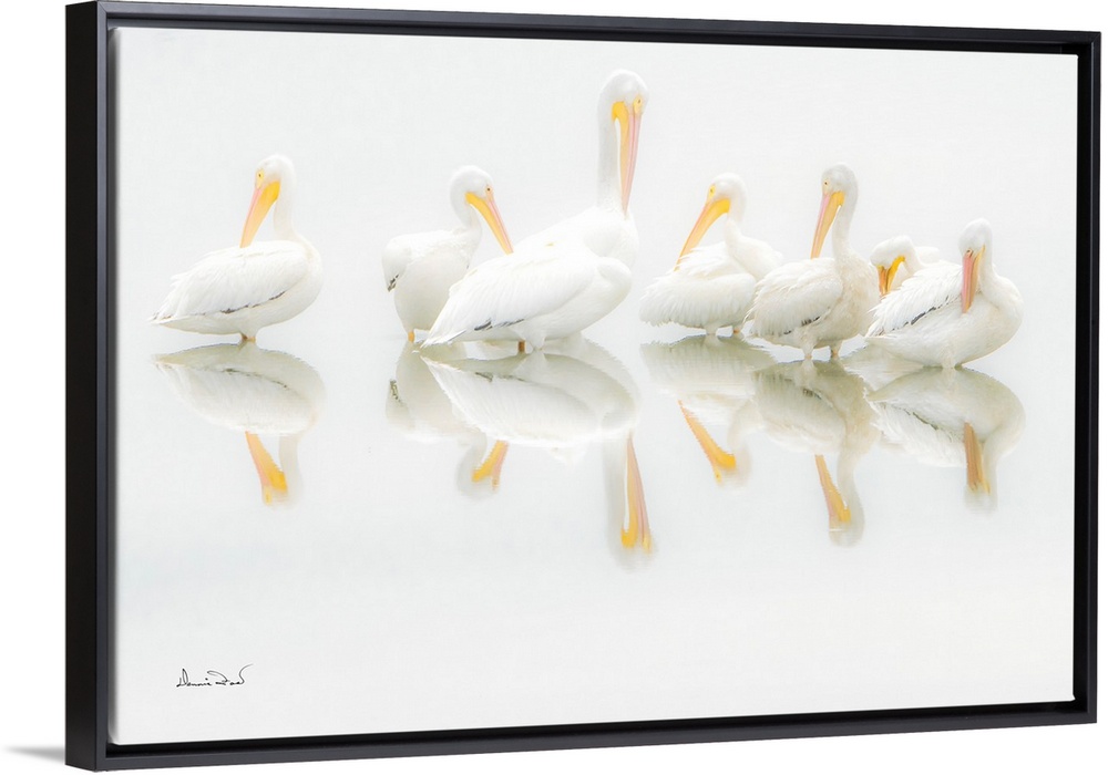 <p>A pod of American White Pelicans (Pelecanus erythrorhynchos) reflected in a pond in heavy morning fog in the Viera Wetlands, Florida , USA.</p>