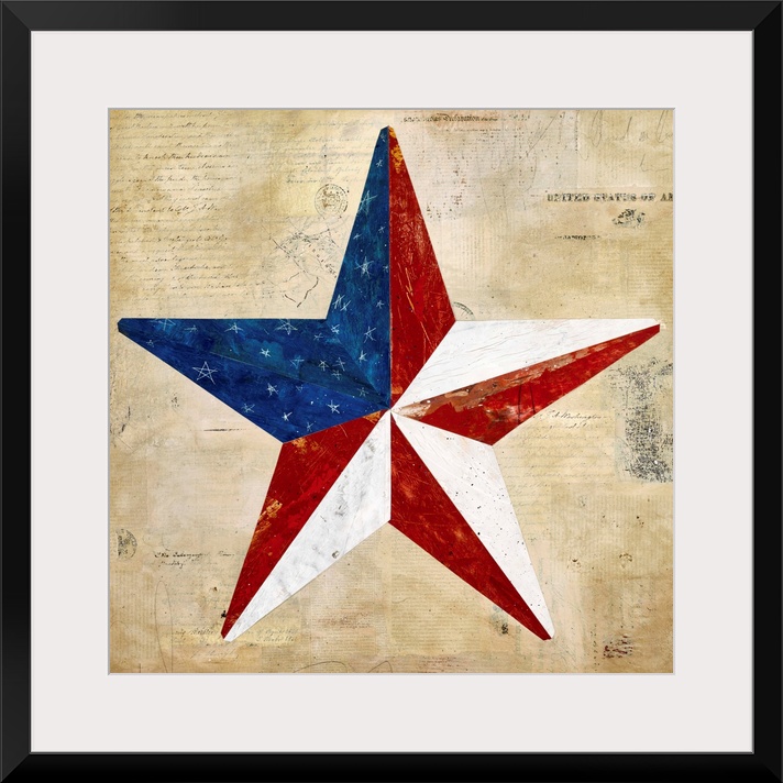 <p>Folk art painting of a star in red white and blue on an antique style background created with mixed media.</p>