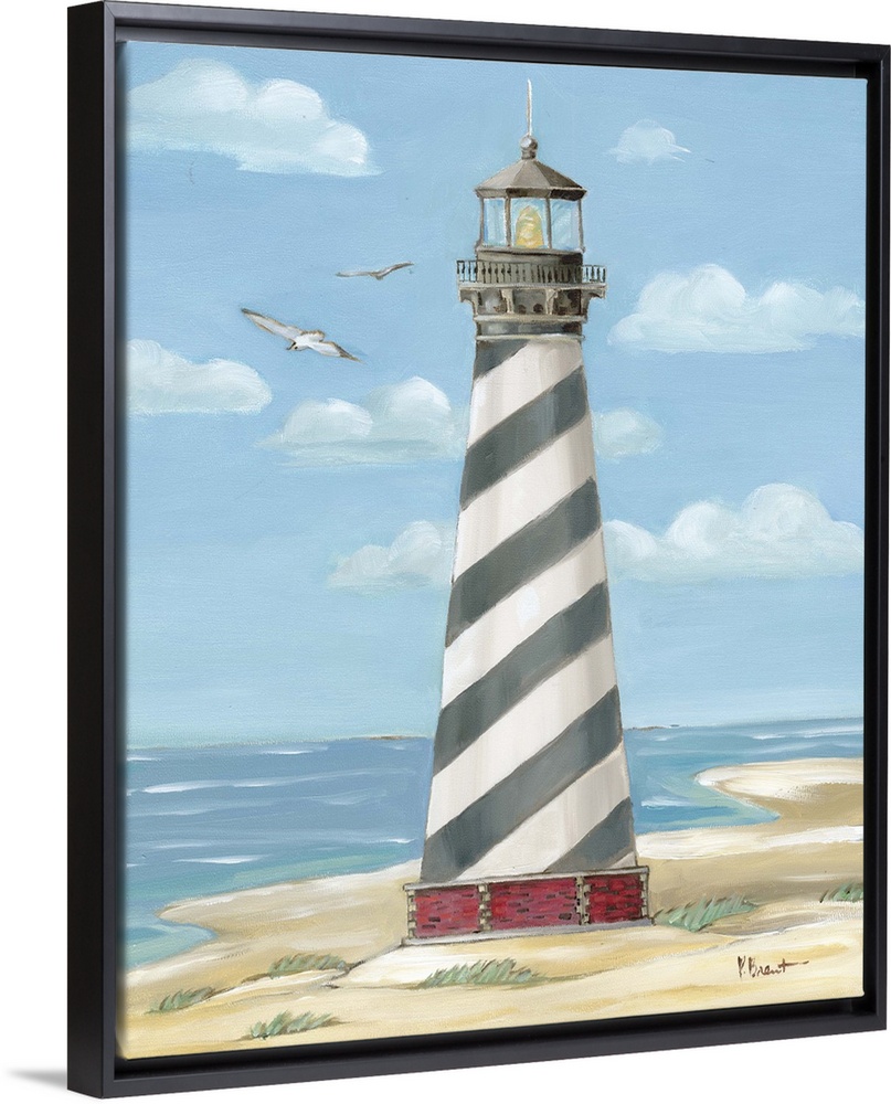 <p>Painting of the striped Cape Hatteras lighthouse on the Outer Banks with a few seagulls.</p>