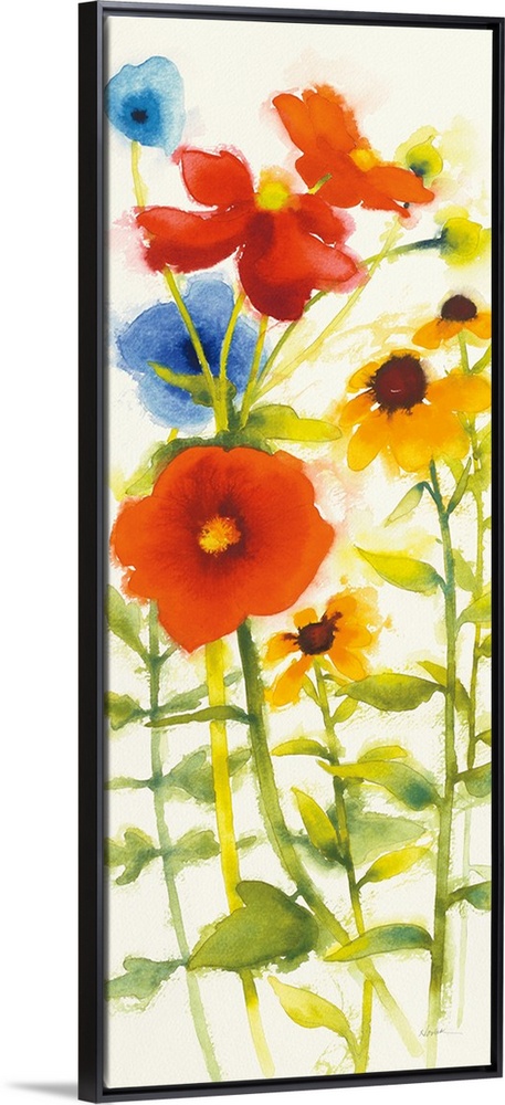 <p>Tall watercolor painting of red, yellow, and blue flowers on a white background.</p>