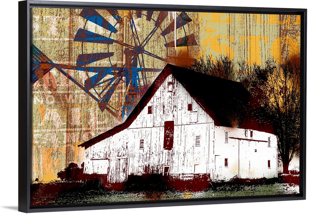 <p>Oversized, landscape artwork of an old barn beneath a large, exaggerated windmill in the sky. The image has a vintage look due to the textured, collaged background.</p>