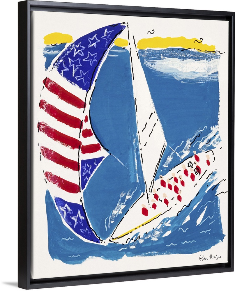 <p>Pen and Ink illustration of America's Cup sailboat with huge spinnaker sail from a bird's eye view.</p>