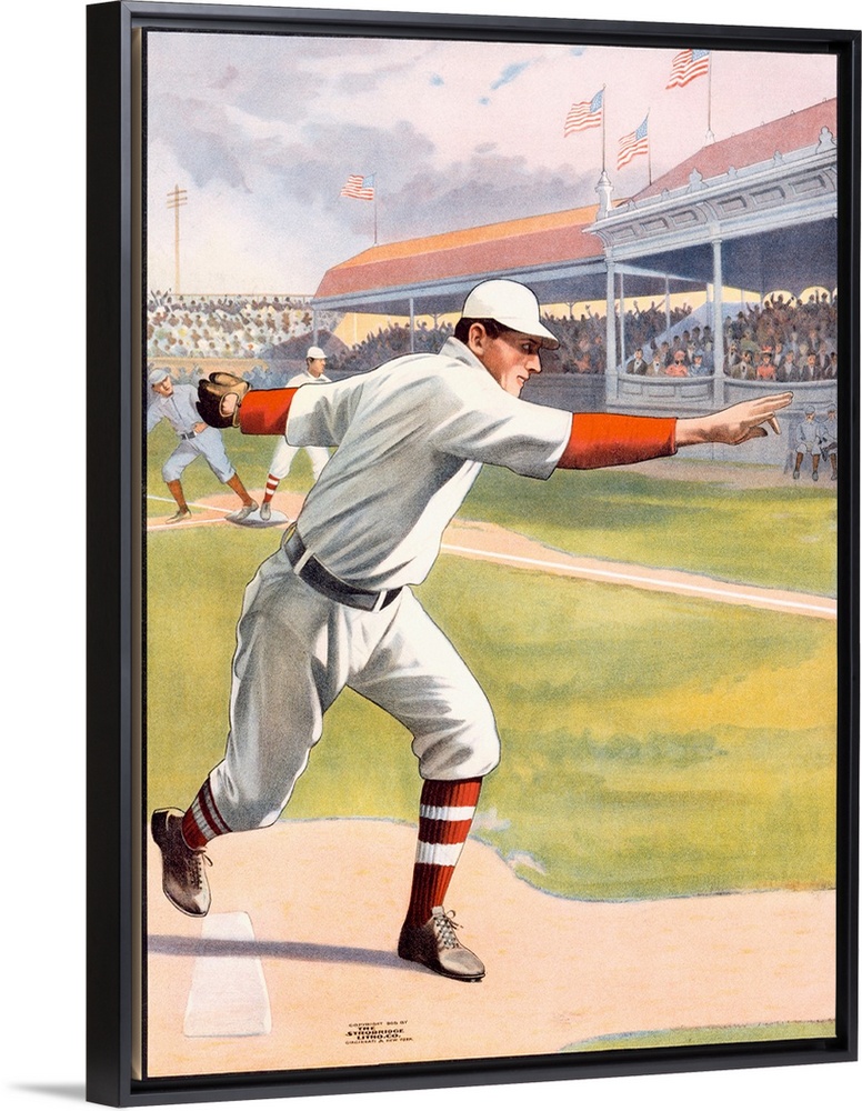 <p>This vintage lithograph captures the golden age of baseball, where a pitcher winds up under the gaze of a packed grandstand waving American flags. The composition emphasizes motion, anticipation, and national pride, echoing the sport's status as a cultural emblem in early 20th-century America. The crisp whites of the uniform contrast with the vibrant crowd and manicured field, elevating baseball to more than a game-it's a symbol of unity, ritual, and emerging modern leisure.</p>