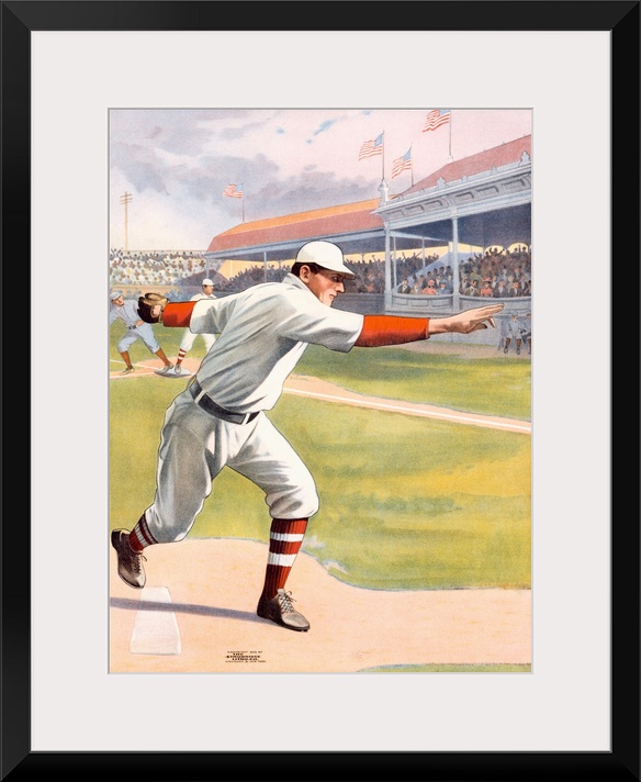 <p>This vintage lithograph captures the golden age of baseball, where a pitcher winds up under the gaze of a packed grandstand waving American flags. The composition emphasizes motion, anticipation, and national pride, echoing the sport's status as a cultural emblem in early 20th-century America. The crisp whites of the uniform contrast with the vibrant crowd and manicured field, elevating baseball to more than a game-it's a symbol of unity, ritual, and emerging modern leisure.</p>