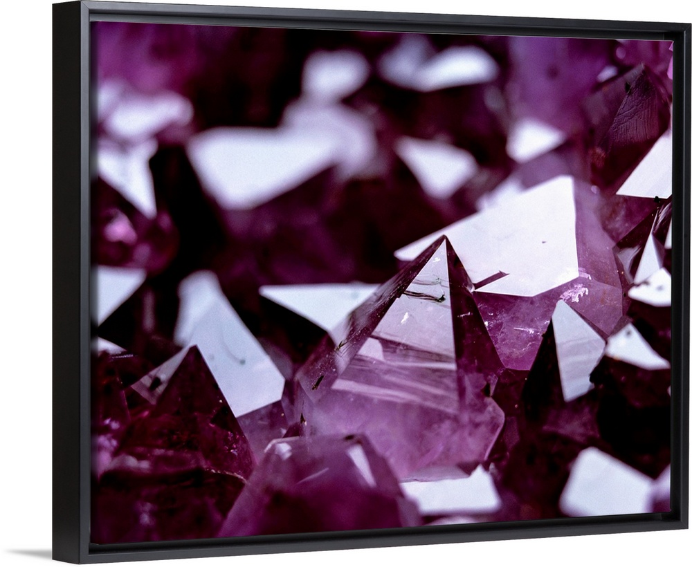 <p>Amethyst crystals, a variety of quartz, (silicon dioxide). The purple colour in amethysts is caused by the presence of compounds of iron or manganese. It is often used as a gemstone in jewellery, especially in rings. Although amethyst is found in Europe and North America, the finest specimens occur in India, Sri Lanka and Brazil.</p>